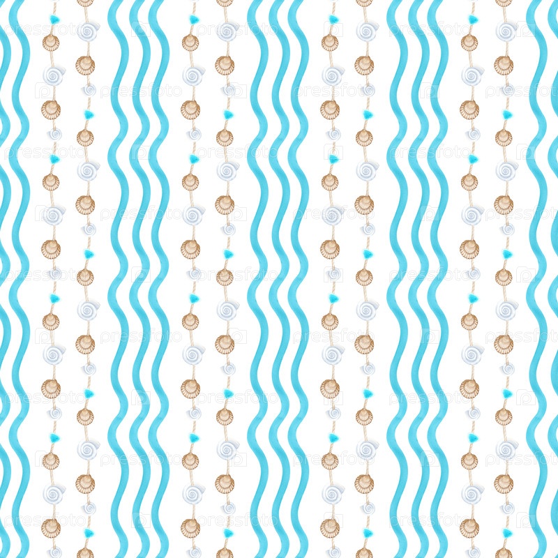 Вертикальный бесшовный рисунок с раковинами на ютовой веревке и абстрактными бирюзовыми волнами. Иллюстрация акварели на изолированном фоне. Бесшовный фон в море, пляжный стиль