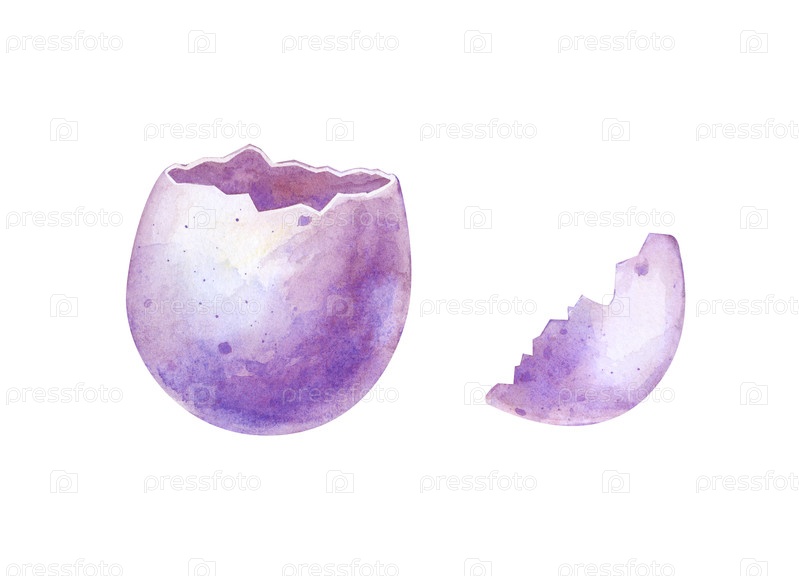 Разбитое куриное яйцо, нарисованное вручную на изолированном фоне. акварельная иллюстрация расколотого яйца. реалистичный клипарт в фиолетовой яичной скорлупе