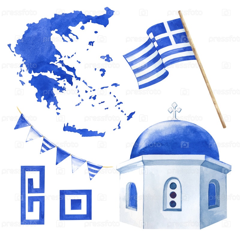 Сборник элементов греческой культуры. Силуэт страны, купол храма, флаги и национальный орнамент Греции в синем цвете. Иллюстрация акварели на изолированном фоне. Реалистичный клипарт для туристических буклетов, образовательных материалов и
