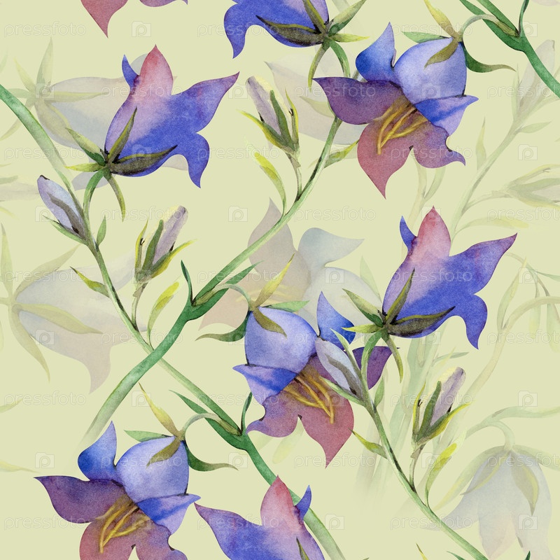 Бесшовный рисунок с реалистичными синими дикими цветами. Акварельная иллюстрация с голубой колокольчиком на светло-зеленом фоне. Бесшовный цветочный фон для обоев, текстиля и посуды