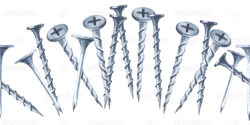 Бесшовная оболочка с железными винтами и гвоздями на изолированном фоне. Акварельная иллюстрация реалистичных строительных инструментов. Услуги по ремонту дома и строительству