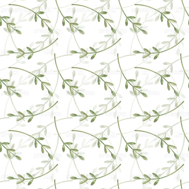 Тонкие ветви с зелеными листьями на белом фоне. Бесшовный рисунок акварелью. Ботанический орнамент с ветками в натуральных цветах. Минимальный бесшовный фон для упаковочной бумаги, обоев и текстиля