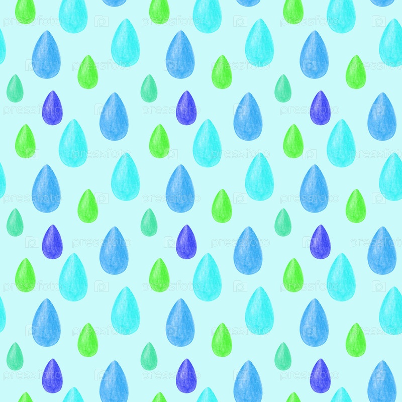 Бесшовный рисунок со стилизованными каплями. нарисованные зеленые и синие капли дождя на светло-синем фоне. бесшовный фон карандаша для обоев в детской комнате, оберточная бумага, текстиль