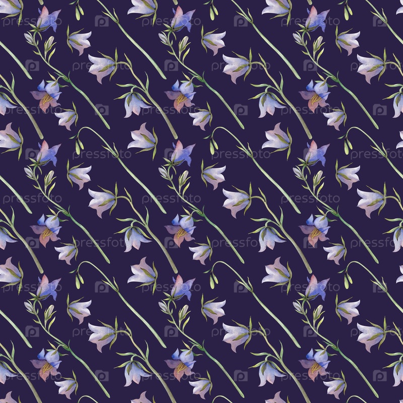 Бесшовный рисунок с синими колоколами. Акварельная иллюстрация с голубыми дикими цветами на темно-синем фоне. Диагональный ботанический фон для текстиля, обоев, посуды