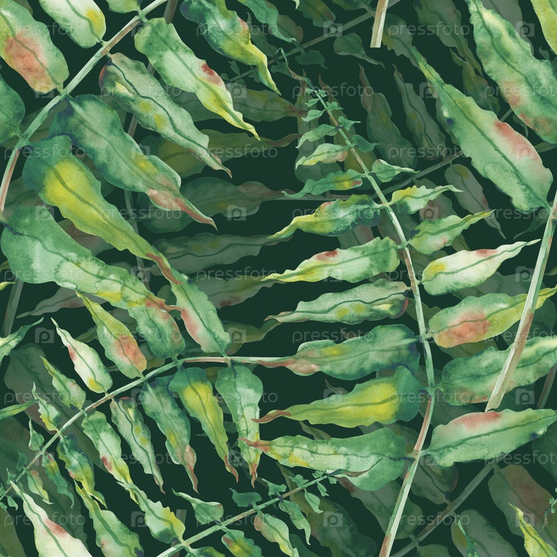 Акварельный бесшовный рисунок с окрашенными ветвями зеленого папоротника. Ботаническая иллюстрация лесного растения на темно-зеленом фоне. Реалистичный шаблон для дизайна лесной темы, упаковки, текстиля, обоев, посуды