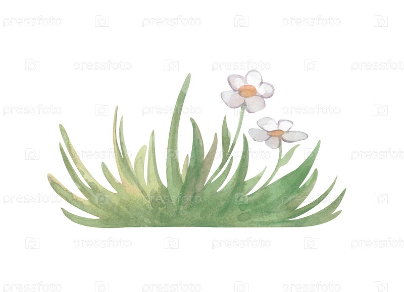 Рисование зеленой травы с белыми цветами в естественных тонах. Иллюстрация акварели на изолированном фоне. Ботанический клипарт с куском травы для летнего декора или скарапбукинга
