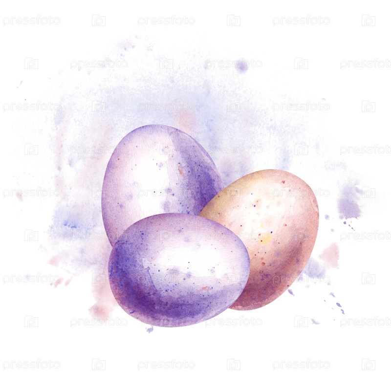 Композиция из трех окрашенных яиц для пасхальных праздников на фоне пятна акварели с брызгами.Реалистичная акварельная иллюстрация яиц со спреем краски на изолированном фоне
