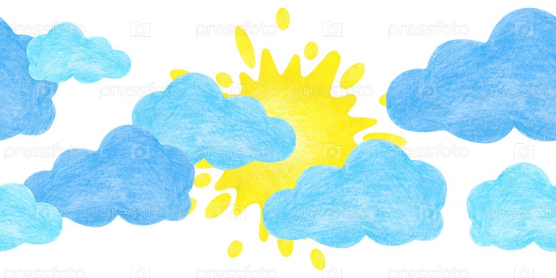 Бесшовная оболочка с солнцем и голубыми облаками, нарисованные вручную. Рисование цветными карандашами на белом фоне. бесшовный фон обоев для детской комнаты, текстиля, упаковки