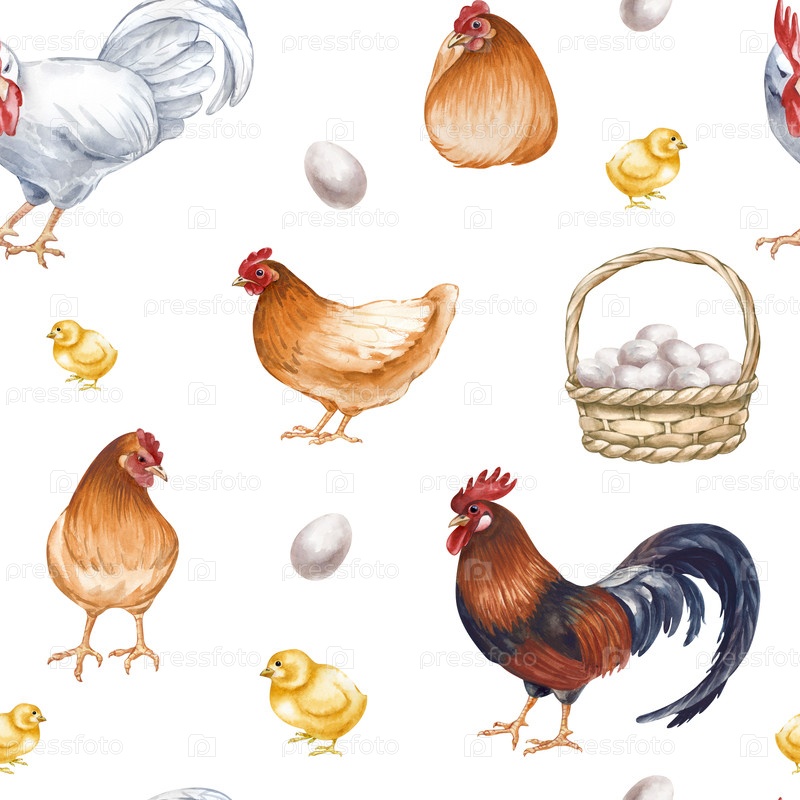 Бесшовный рисунок птичьего двора на изолированном фоне. Акварельная иллюстрация куриц, петухов, цыплят, яиц и корзин с свежими цветами. Винтажные реалистичные чертежи птиц для сельского хозяйства, упаковки, обоев и текстиля