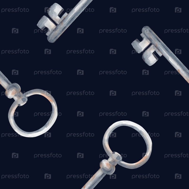 Бесшовный рисунок с ржавыми клавишами на темном фоне. Иллюстрация акварели с винтажными предметами в натуральных цветах. Шаблон с реалистичными ключами для дизайна обоев, упаковки, текстиля