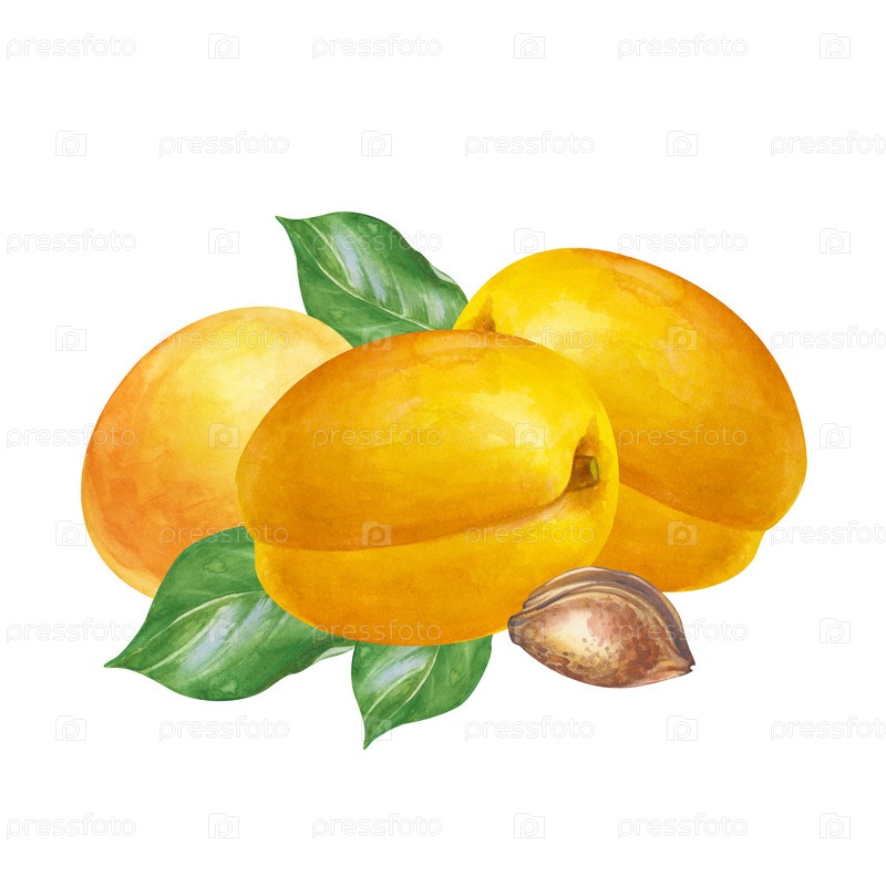 Композиция акварели с спелыми абрикосами на изолированном фоне. Ботаническая иллюстрация со зрелыми плодами, зелеными листьями и ямами. Фруктовый клипарт для дизайна продуктов питания и косметических линий