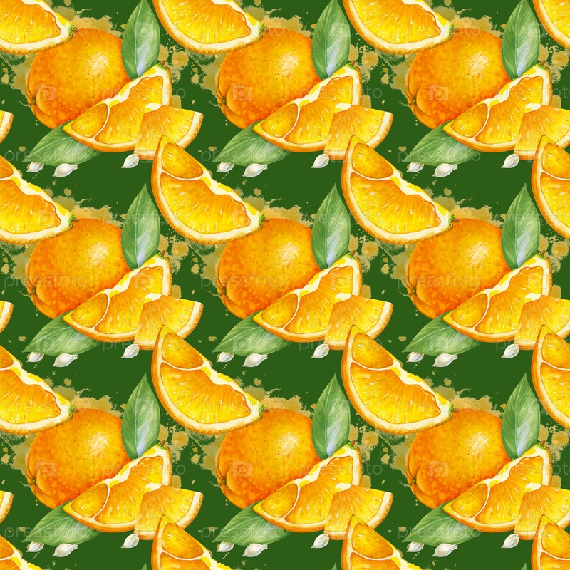 Бесшовный рисунок с апельсинами, ломтиками, семенами и листьями на зеленом фоне. Иллюстрация акварели с сочными фруктами. Яркий ботанический шаблон для упаковки, текстиля, обоев и посуды