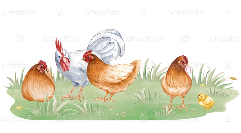 Композиция с белым петухом, коричневыми цыплятами и курицей на зеленой траве. акварельная иллюстрация семьи кур в птичьем дворе в натуральных цветах. реалистичные птицы на изолированном фоне для празднования Пасхи и сельскохозяйственной продукции