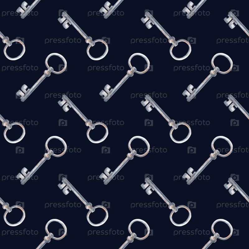 Винтажный бесшовный рисунок с ржавыми клавишами на темном фоне. Иллюстрация акварели с реалистичными объектами в натуральных цветах. Шаблон со ключами для дизайна обоев, упаковки, текстиля