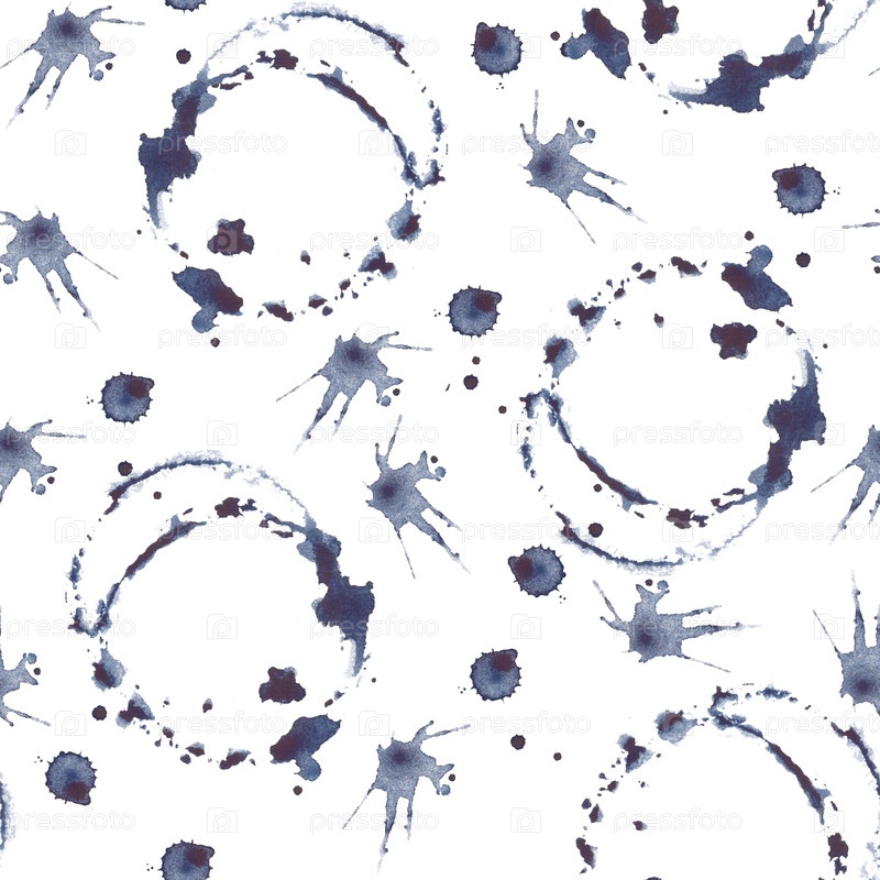 Бесшовный рисунок с пятнами краски, круглыми оттисками и брызгами на изолированном фоне. Иллюстрация с темными полосами акварельной краски. Шаблон акварели для художественных проектов, обоев, текстиля, упаковки