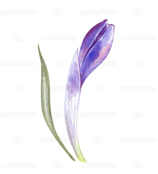 Маленький фиолетовый бутон крокуса с зеленым листьем. Акварельная иллюстрация роста примарозы на изолированном фоне. Реалистичный клипарт весенних цветов для Пасхи, открытки, приглашения