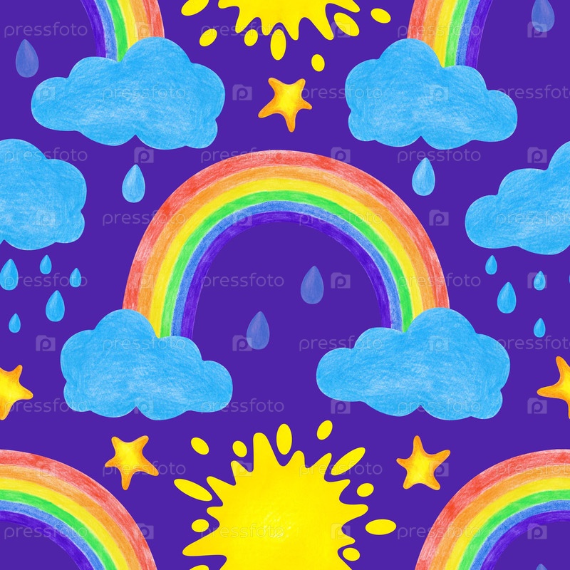Многоцветный бесшовный рисунок с радугой, облаками, солнцем, звездами и дождем, написанный вручную. Рисование цветными карандашами на синем фоне. Красочный детский безшифровый шаблон для обоев, текстиля, упаковки
