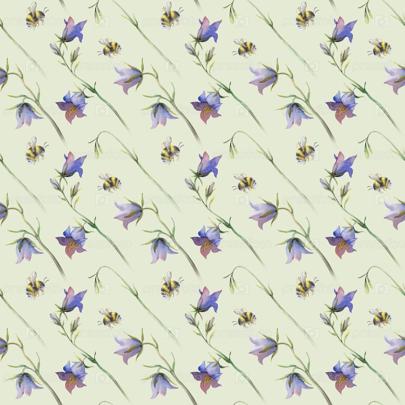 Диагональный бесшовный рисунок с голубым колокольчиком и летающими шмелями на светло-зеленом фоне. Илюстрация акварели с полевыми цветами в естественных оттенках. Реалистичное украшение для летних тем, обоев, текстиля