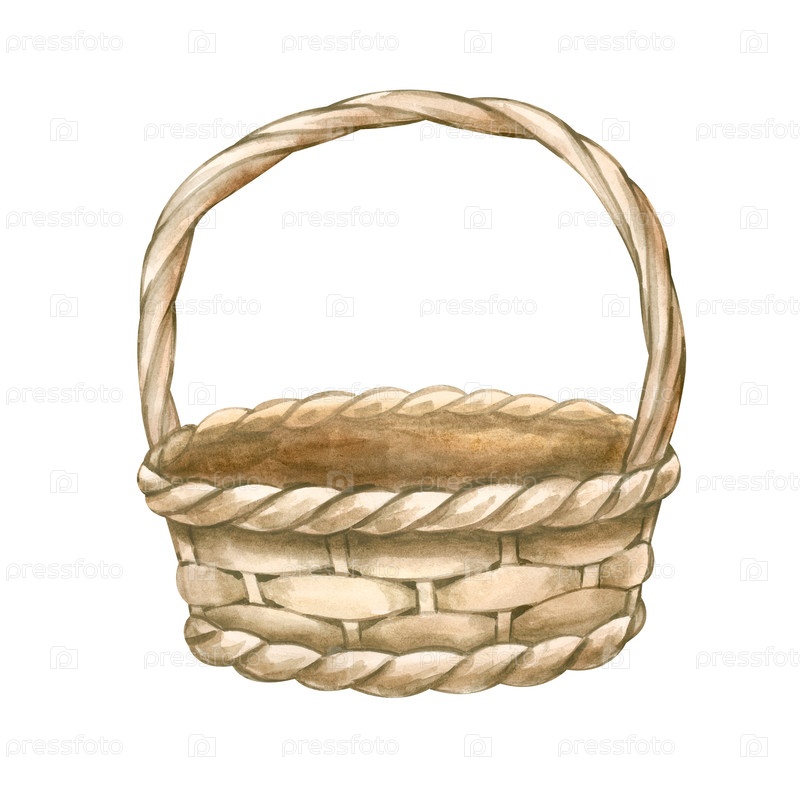 Пустая плетеновая корзина с деревенской ручкой. иллюстрация акварели на изолированном фоне. винтажный клипарт с реалистичной круглой корзиной для сельского хозяйства, пикника и садоводства