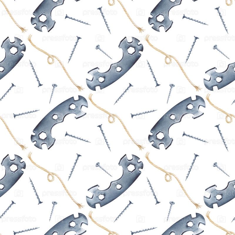 Диагональный бесшовный рисунок с металлическим велосипедным ключом, куском ютовой веревки и винтами на изолированном фоне. Илюстрации акварели с рабочими инструментами. Реалистичный шаблон с мужскими инструментами для обоев, упаковки и печати
