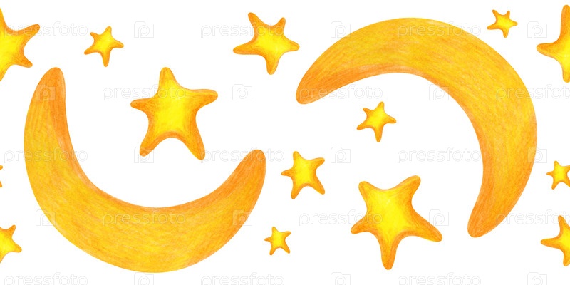 Бесшовная граница с золотыми звездами и полумесяцем, нарисованные вручную. чертеж карандашом ночного неба на изолированном фоне. бесшовный шаблон для обоев, текстиля и посуды