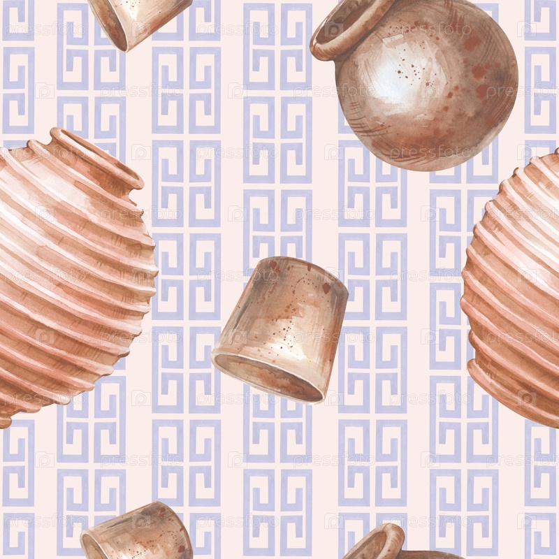 Вертикальный бесшовный рисунок с глиняными горшками и национальными греческими орнаментами на светлом фоне. Илюстрация акварели с реалистичной керамикой. Шаблон с традиционными элементами греческой культуры для обоев, упаковки, текстиля