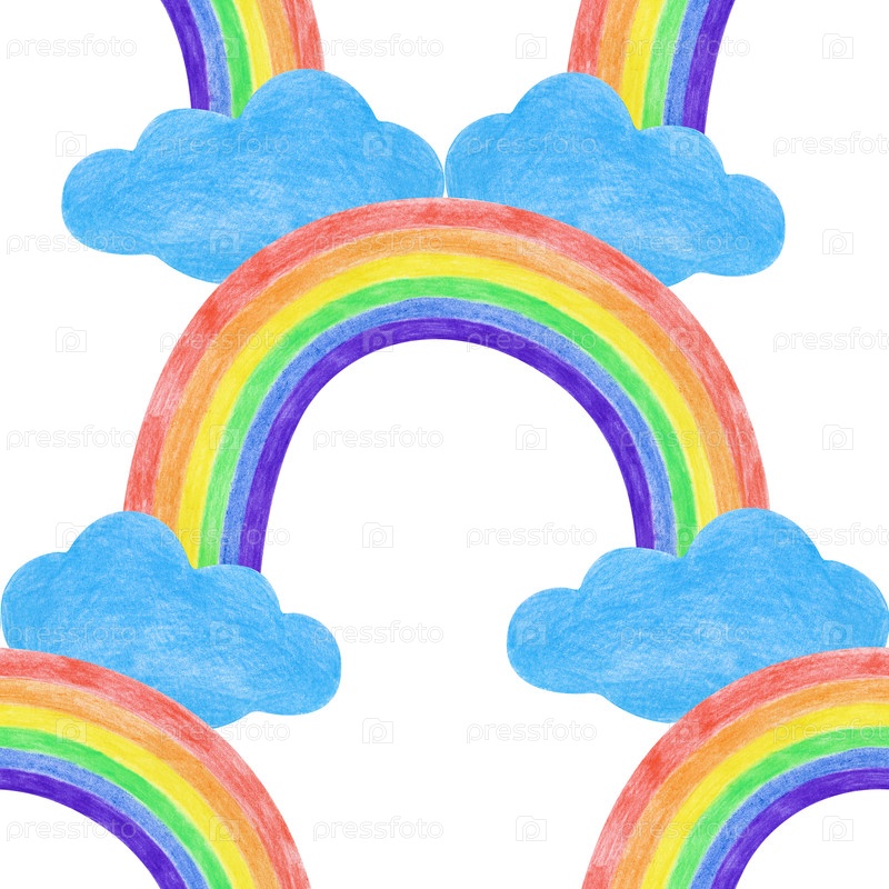 Бесшовный рисунок радуги, выполненный цветными карандашами. Рисование с многоцветной радугой и облаками на изолированном фоне. Детское рисование для текстиля, упаковки, обоев