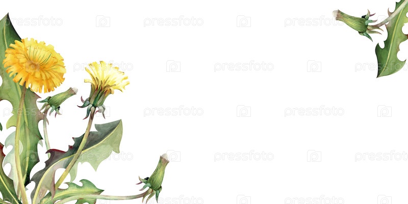 Горизонтальная рама с желтыми цветами одуванчика, почками и зелеными листьями. Иллюстрация акварели на изолированном фоне. Ботанический цветочный шаблон для открыток и приглашений