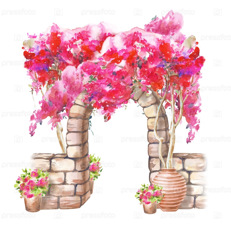 Акварельная композиция с каменной коричневой аркой, кустом пышного розового бугенвиля и керамическими горшками. иллюстрация на изолированном фоне. реалистичный клипарт с традиционными средиземноморскими архитектурными элементами для туристического бизнеса