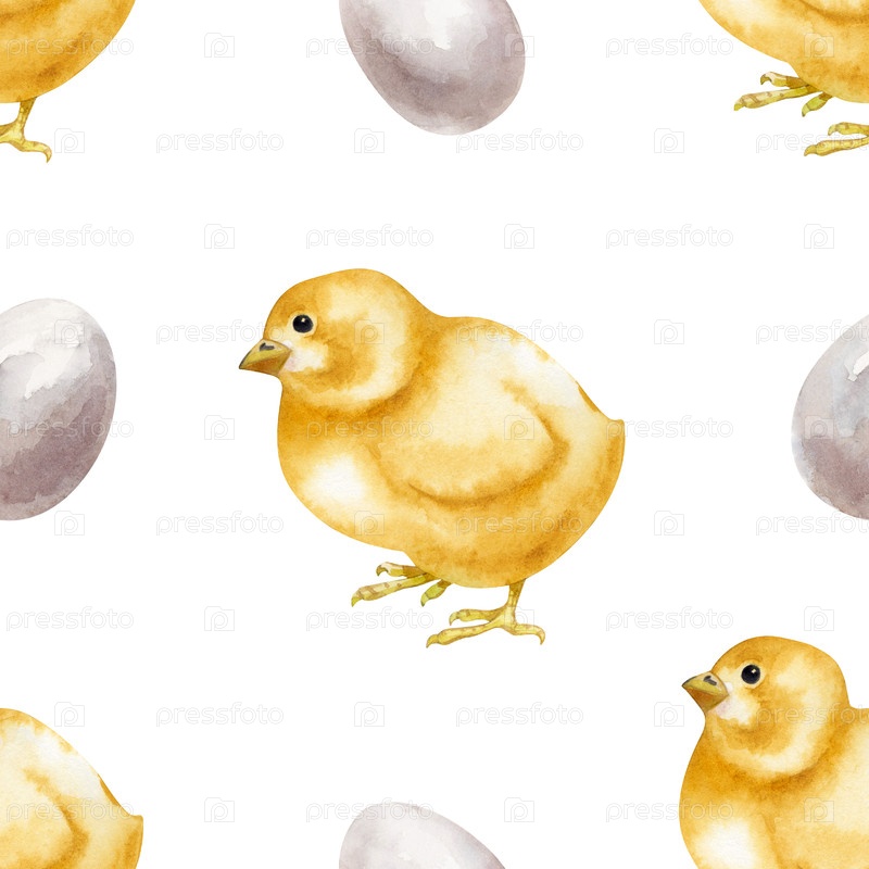 Бесшовный рисунок с желтыми цыплятами и яйцами. Изолированная акварельная иллюстрация. Рисование птиц во дворе птицы в натуральных цветах. Реалистичная курица для экологически чистого дизайна продуктов питания и темы ферм