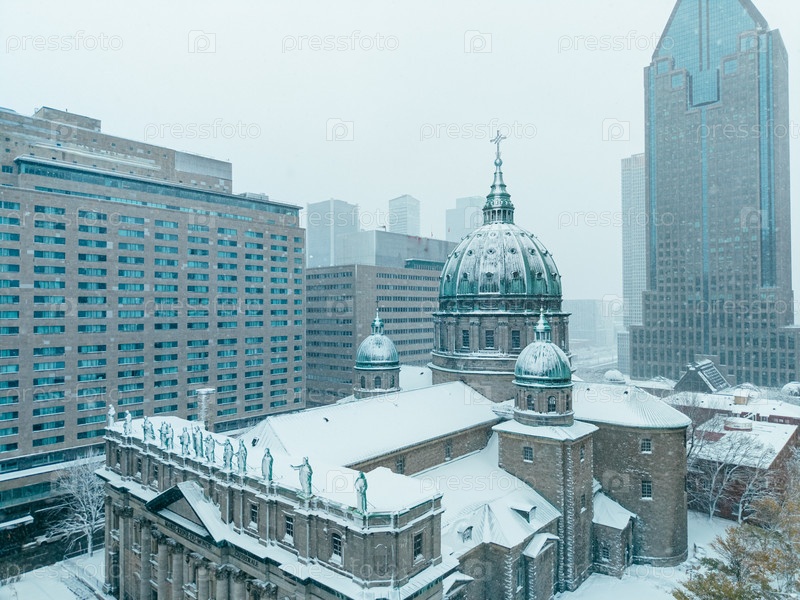 Снежный воздушный вид центра Монреаля с собором Марии Королевы Мира во время снега и шторма