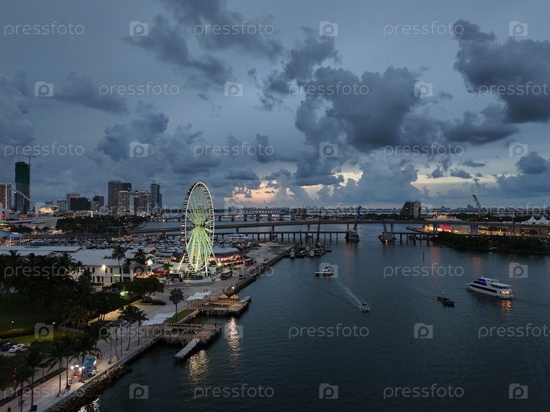 Горизонт центра Майами на закате с освещенным колесом обозрения и береговой линии Марина, Флорида, США