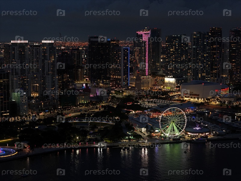 Горизонт центра Майами на закате с освещенным колесом обозрения и береговой линии Марина, Флорида, США