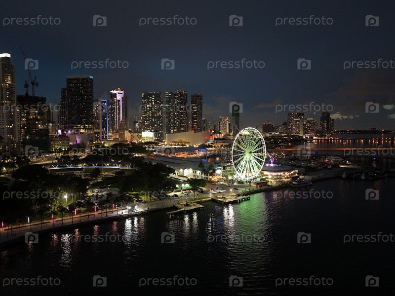 Горизонт центра Майами на закате с освещенным колесом обозрения и береговой линии Марина, Флорида, США