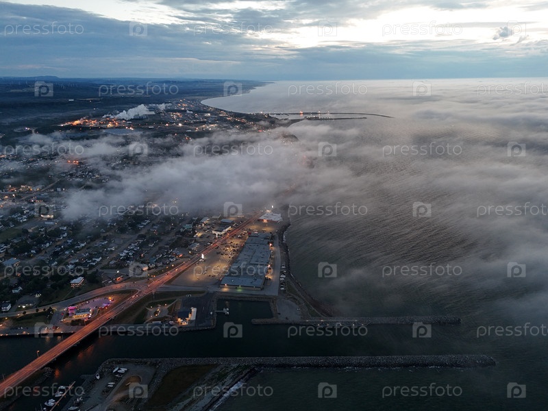 Вид из воздуха города Матане на закате с рекой, туманом, низкими облаками и городскими огнями вдоль реки Святого Лоуренса, Квебек, Канада