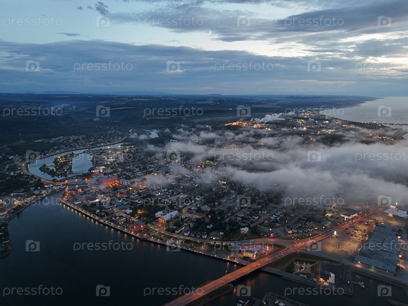 Вид из воздуха города Матане на закате с рекой, туманом, низкими облаками и городскими огнями вдоль реки Святого Лоуренса, Квебек, Канада