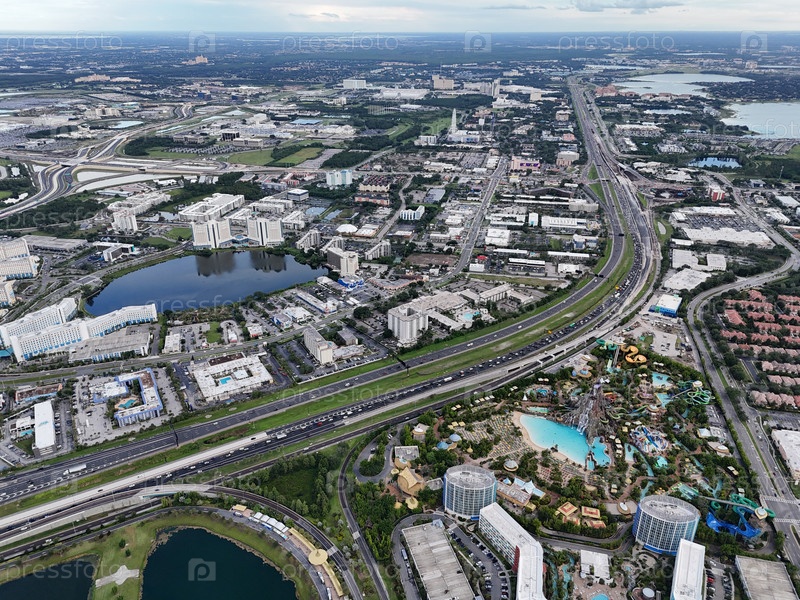 Вид с воздуха на аквапарк Volcano Bay с вулканом, бассейнами, горками и близлежащим движением в Орландо, штат Флорида, США