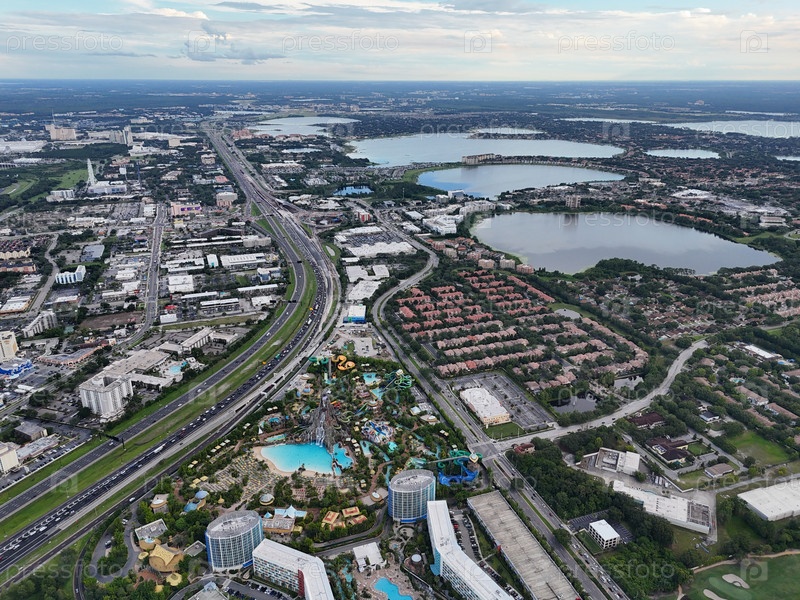 Вид с воздуха на аквапарк Volcano Bay с вулканом, бассейнами, горками и близлежащим движением в Орландо, штат Флорида, США