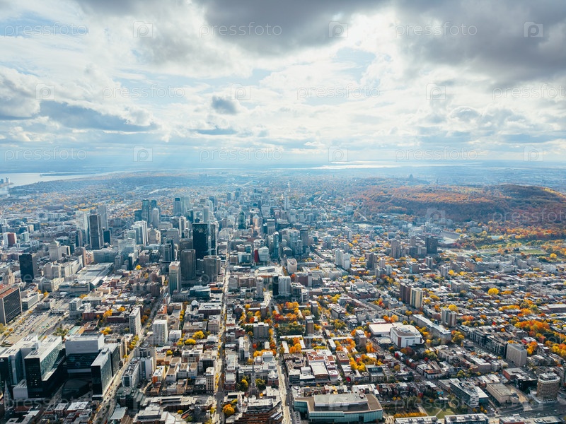 Осенний воздушный вид горизонта Монреаля с многоэтажными зданиями под облачным небом