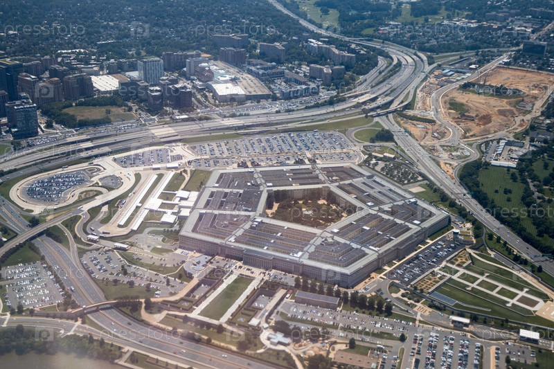Вид с воздуха на комплекс Пентагона с окружающими дорогами, парковкой и зеленью