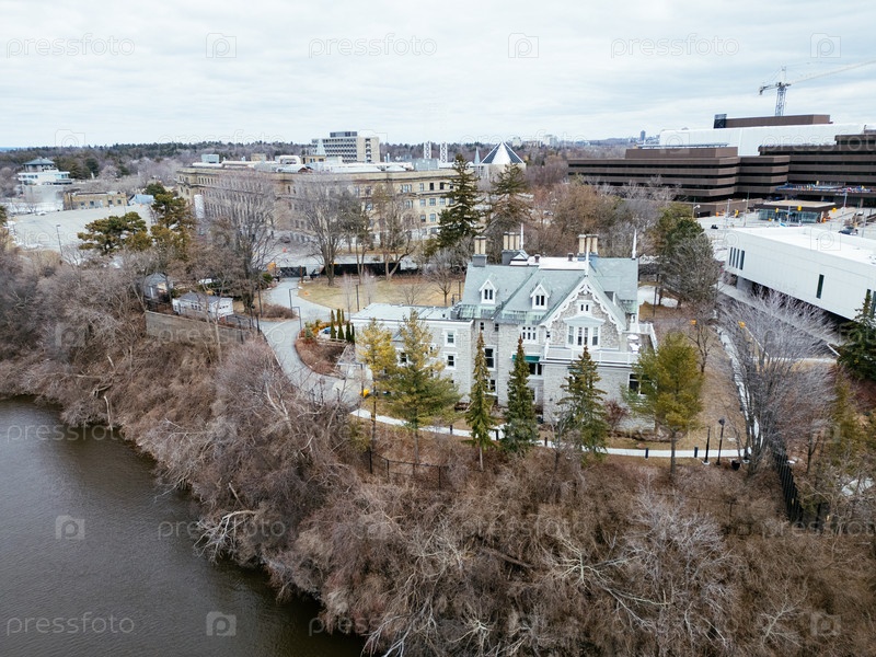 Вид с воздуха на Национальный исторический объект Эрнсклифф в Оттаве, окруженный зимним пейзажем и современными зданиями