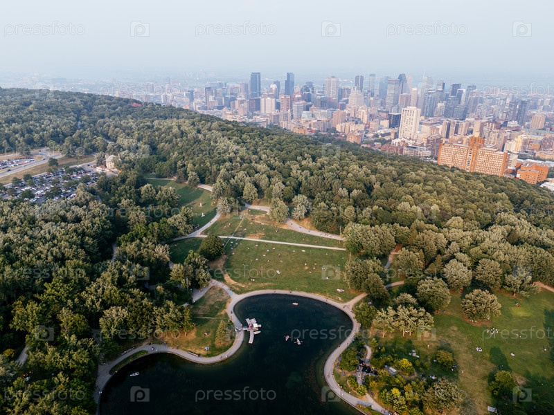 Вид из воздуха на озеро Бобра в Королевском горном парке с горизонтом Монреаля, легким смогом, туманом и атмосферой восхода солнца. g