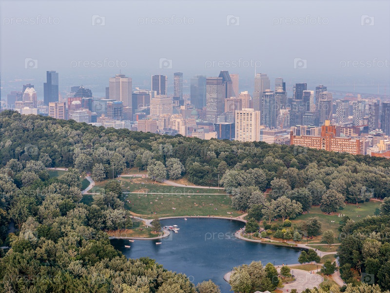 Вид из воздуха на озеро Бобра в Королевском горном парке с горизонтом Монреаля, легким смогом, туманом и атмосферой восхода солнца. g