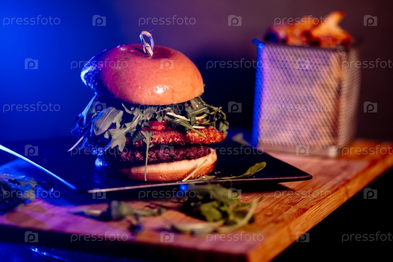 Сочный бургер с салатами и хрустящими картофелями на деревянной доске под теплым освещением