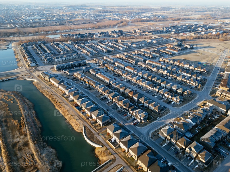 Вид с воздуха на пригородную застройку Barrhaven в Оттаве во время раннего зимнего утреннего света