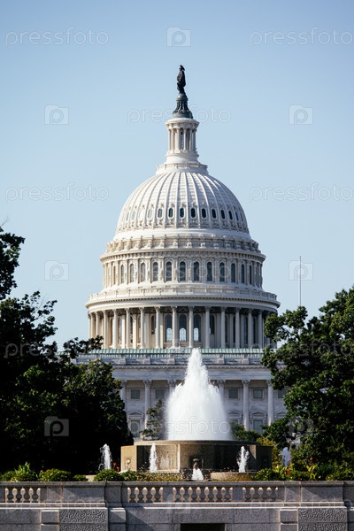 Здание Капитолия Соединенных Штатов с культовым куполом и американским флагом под чистым голубым небом в Вашингтоне, округ Колумбия, США