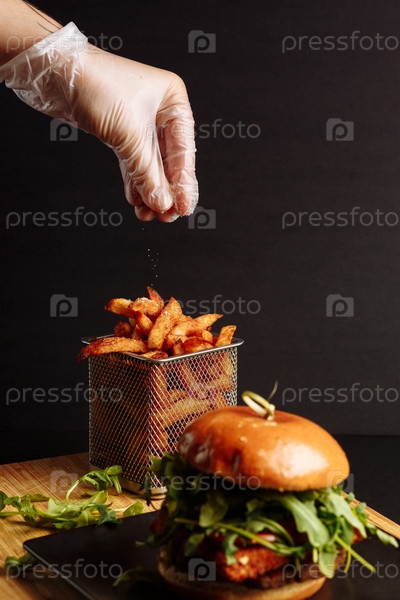 Рука повара в перчатках приправляет картошку рядом с веганским бургером с растительным пати и ругулой на деревянной доске