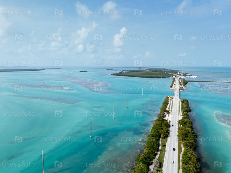 Вид с воздуха на бирюзовый океан, остров мангровых деревьев и зарубежную автомагистраль в Флорида Кейс с лодками и чистой водой