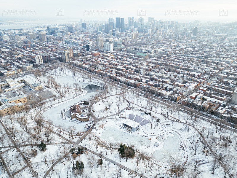 Ландшафт фонтана с замерзшим снежным озером.Монреаль, Квебек, Канада