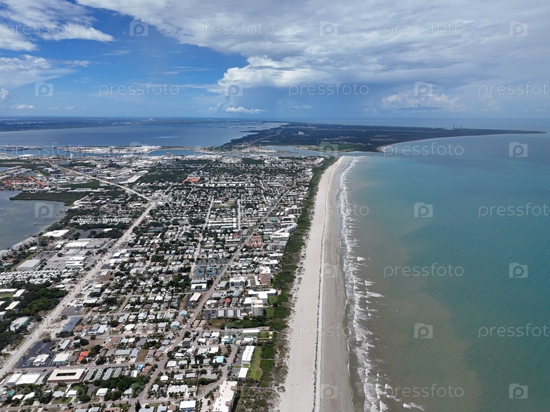 Вид с воздуха береговой линии мыса Канаверал с песчаным пляжем, Атлантическим океаном, прибрежным городом и облачным небом. g
